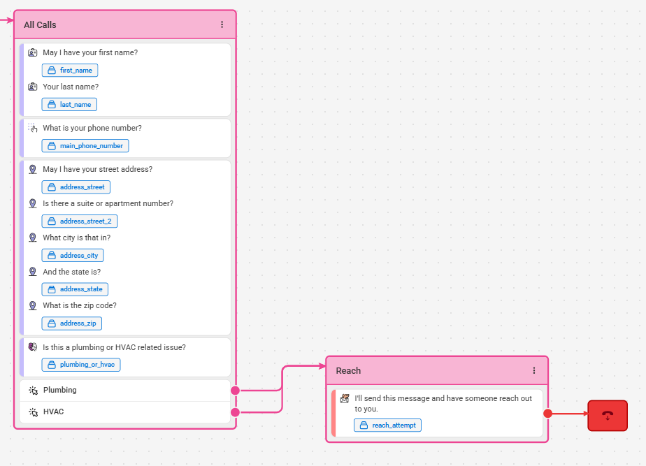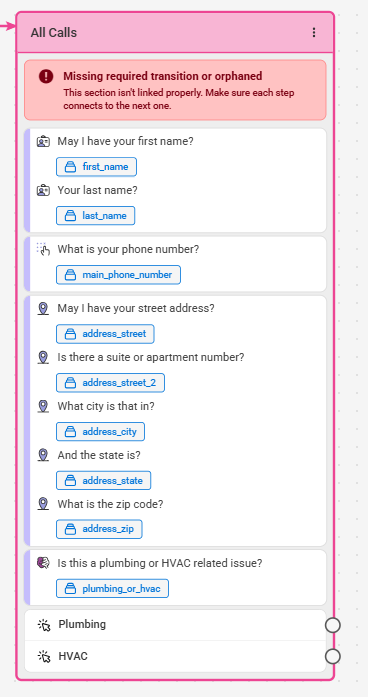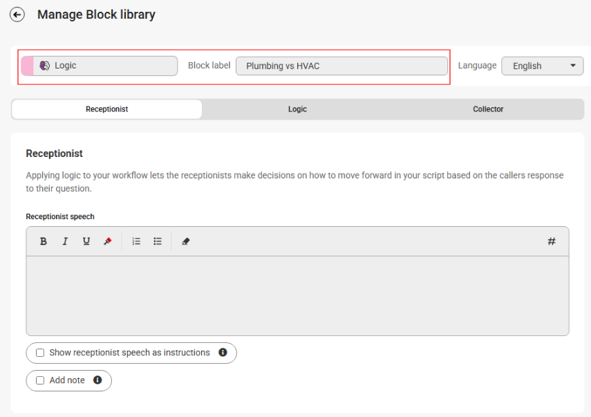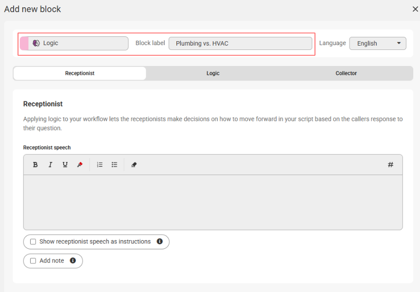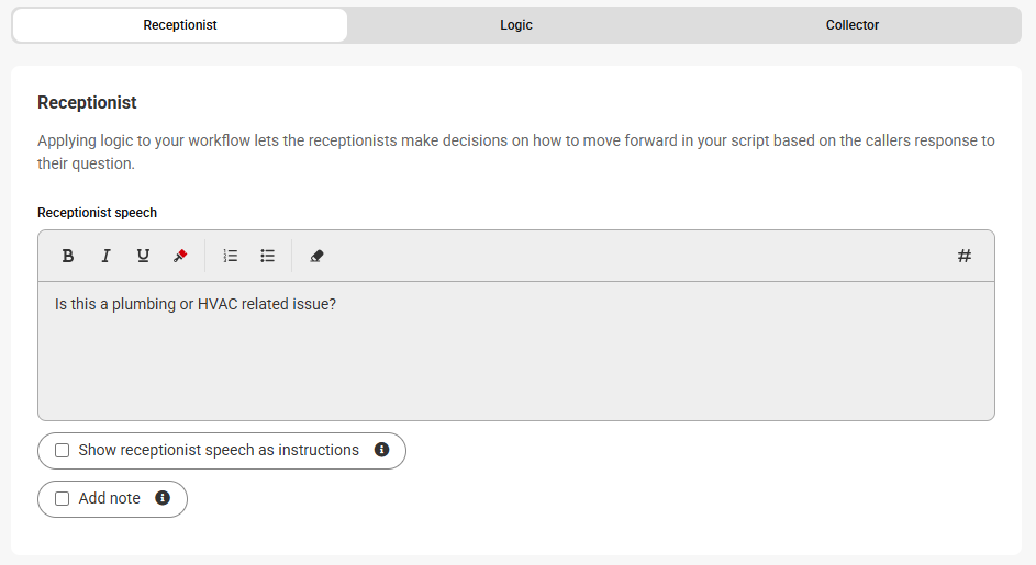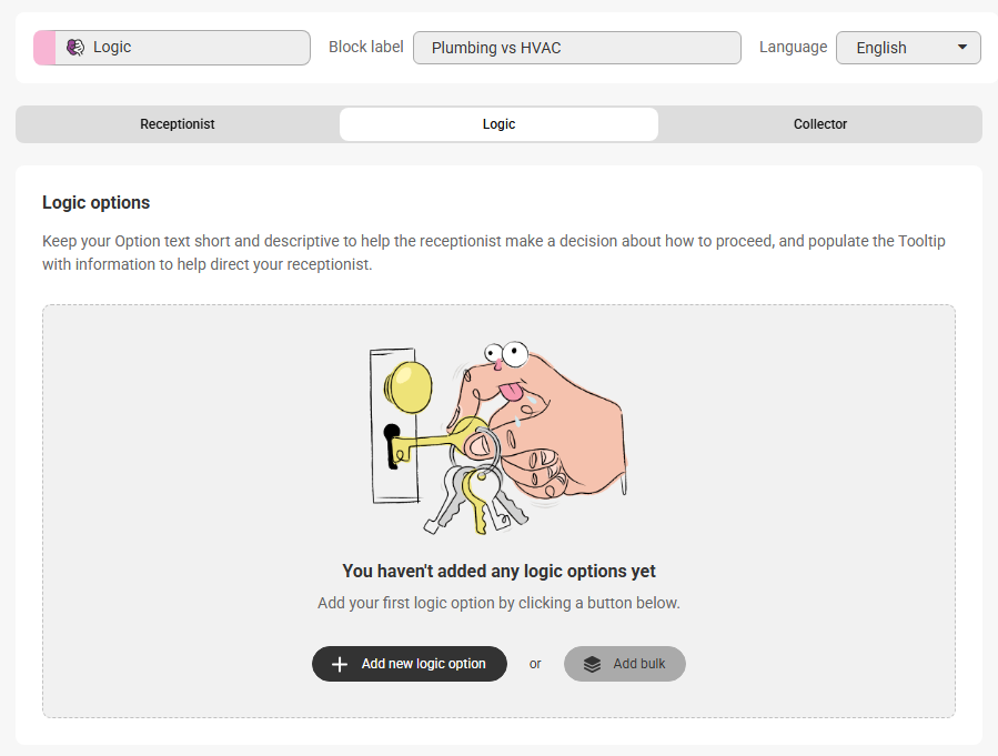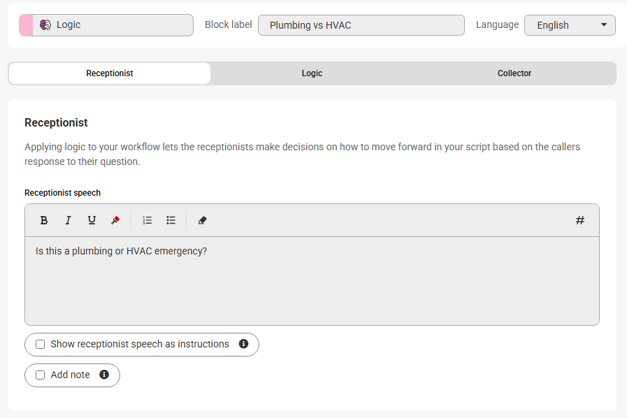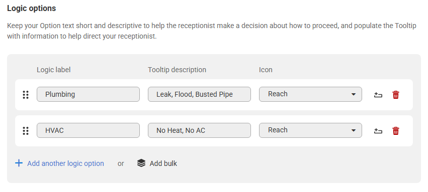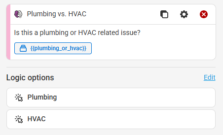 Logic options should be used when different call scenarios require different procedures or outcomes. Including them in your script will help streamline calls and allow your team to better prioritize callbacks. We've created options below that will take agents to a distinct set of questions for Plumbing vs. HVAC emergencies.