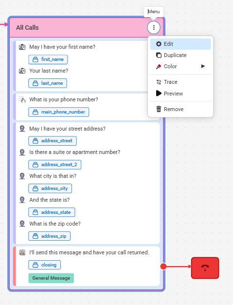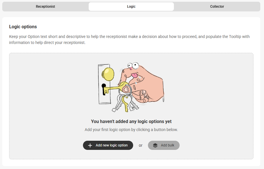 Within your script, a Logic Option can be used to provide the operators with different call options depending on the caller’s response or request. For example, a medical practice may want to set up a logic option for callers who are looking to schedule appointments, callers who are having an emergency, and callers who just have general questions. The appointment option can follow a path that leads to an online calendar, the emergency option can lead to a transfer to the on-call doctor, and the general call path can gather basic information for a return call.