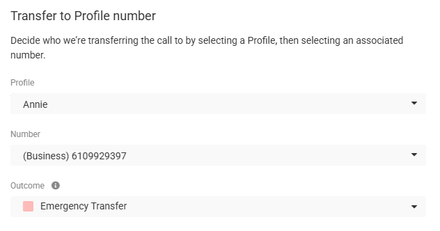 Next scroll down to the Transfer to Profile number section so you can tell the system which number to dial. Select a Profile, an associated number, and then choose an Outcome which will help you easily identify calls within your IVR log.