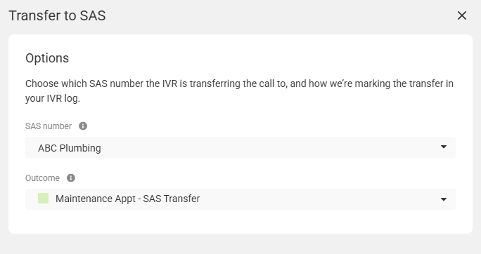 On the panel that appears on the right-hand side of your screen, select the SAS Number you wish to transfer calls to, as well as the Outcome. Then click Save.
