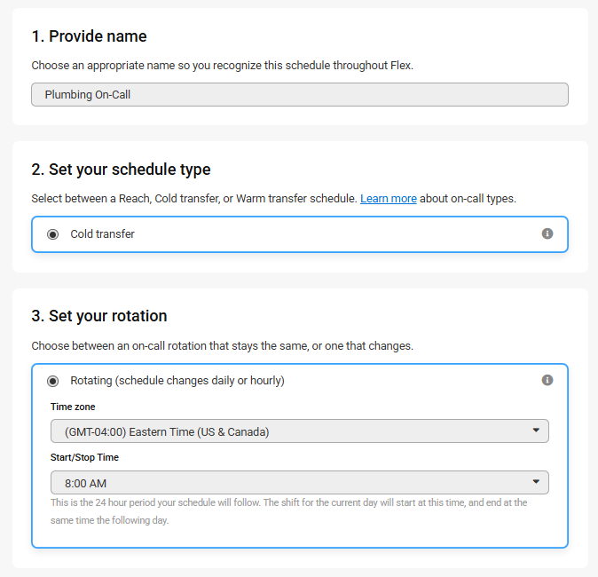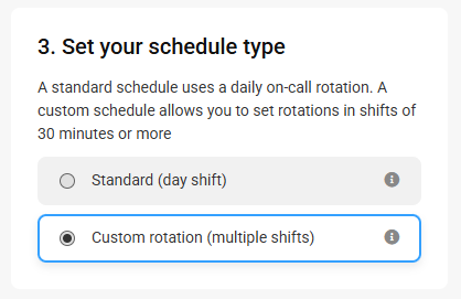 Next you'll need to select your Schedule Type. In this example, we want different members to rotate throughout the 24-hour period, so we'll choose Custom rotation.