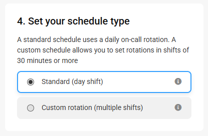 Next, you'll need to select your Schedule Type. In this example, we'll want the same person on-call throughout the 24-hour shift, so we'll choose Standard.