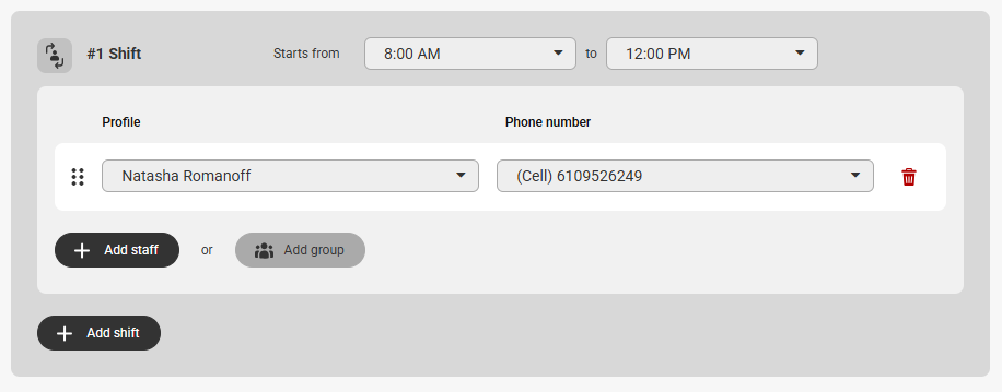 To update the time blocks, first edit the second time-slot drop down. Note that you will not be able to change the first time slot, as that will always reflect your Start / Stop time. In our example, we'll want Natasha to be on-call from 8:00 AM to 12:00 PM.