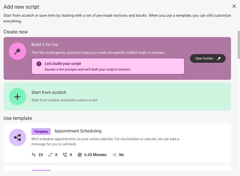 - Start from scratch: This option will allow you to start building your script from scratch. You'll need to create your own script blocks and script sections.