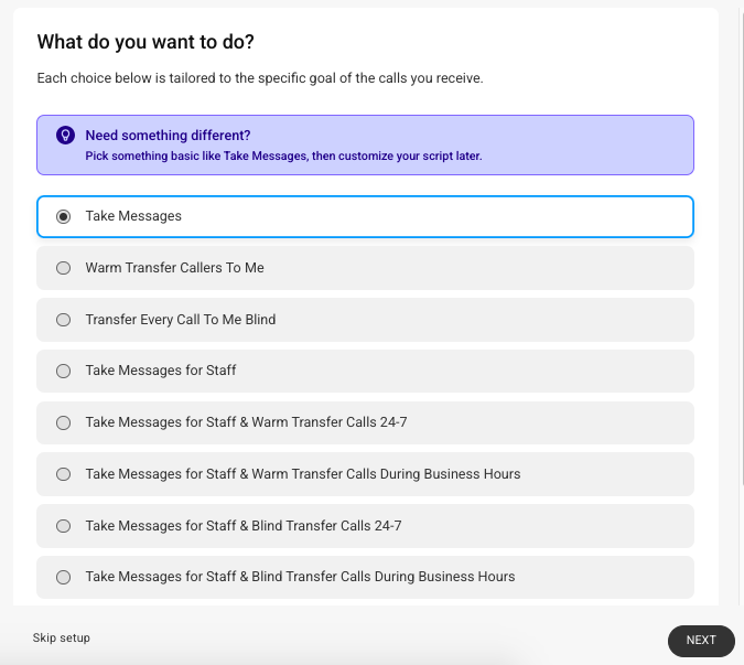 Now you'll need to choose the type of scripting you want applied. Options range from taking basic messages to transferring callers and scheduling via Google Calendar. When you are ready to move on, click Next.
