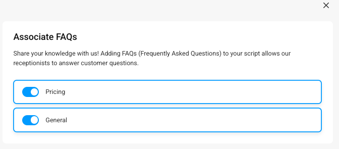If you have created any FAQs, you'll be able to associate them with your new script here. Simply toggle on the FAQs you want to be applied, and click Next.