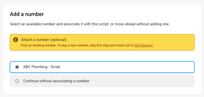 NOTE: If your current script is already assigned to a number, you won't be able to select the number from this window. You'll need to go back to your main Scripts page, un-assign the number from your current script, and re-assign it to your new one.