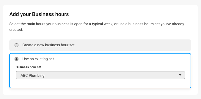 On the next screen, you'll be asked to choose your business hours. You can either select one of the pre-set options, or if you've already created your own business hours set, you can choose that at the bottom. When you are ready to move on, click Next.