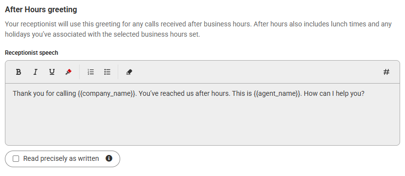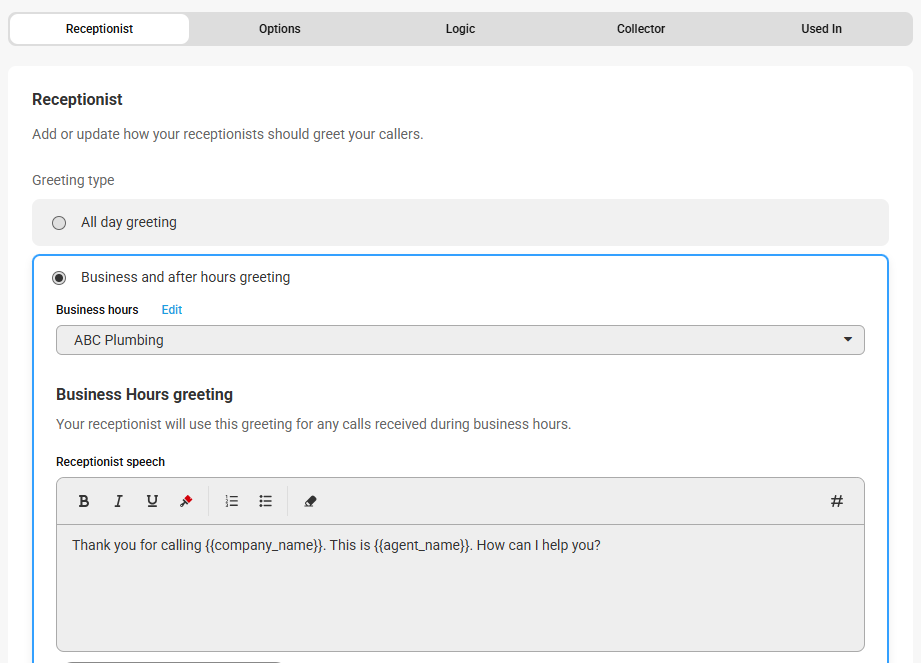 In your Greeting block, under the Receptionist tab, choose Business and after hours greeting as your Greeting type. Then, from the Business Hours dropdown, select the business hours set you've created, and fill in the Receptionist speech area accordingly.