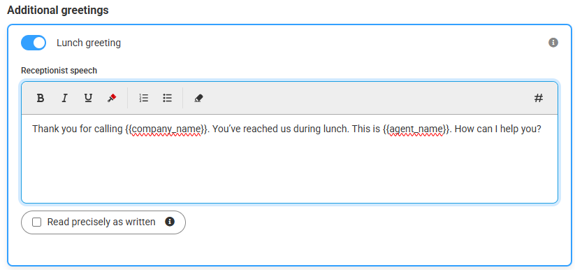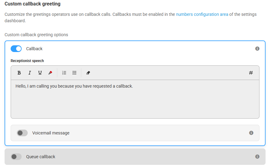 If you are using any of our call back features, you can also customize the greeting the operators will use when they call your customers back.