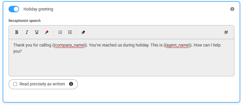 - Holiday Greeting: Once activated, the Holiday Greeting will show instead of your After Hours greeting on calls received during any holidays you’ve associated with your business hours.