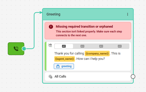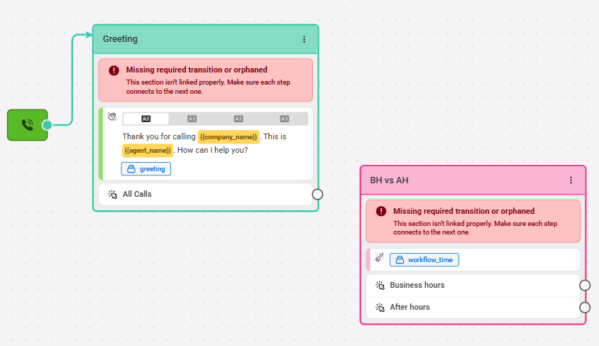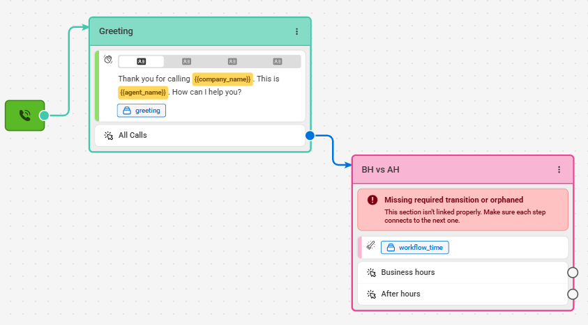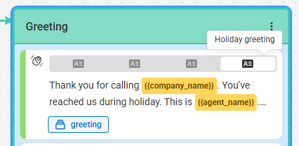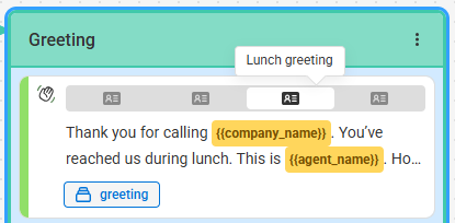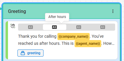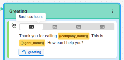 Continue editing your Greeting block as necessary. Once you are finished, click Save. Back in your script workflow, your business hours and after hours greetings will be visible in the Greeting block as shown below.