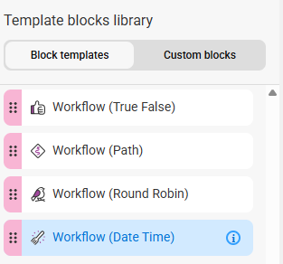 On the next page, click the Blocks tab, then select Add new block. From the Blocks list under Block Templates, locate and select the Workflow (Date Time) block.