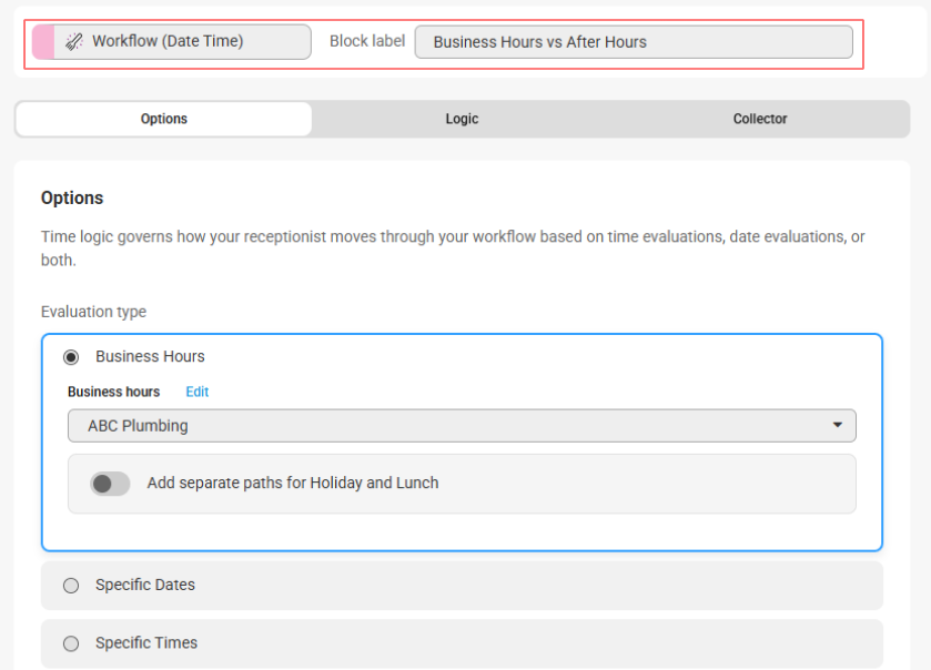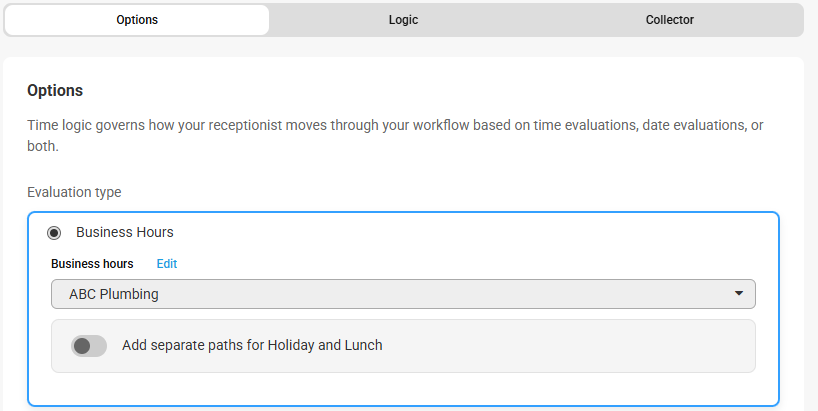 Under the Options tab, select your Evalutation Type. In this case, we'll choose the Business Hours option and select our business hours set from the drop down. If you want separate paths for calls that come in during Holidays or Lunch hours, use the applicable toggle as shown below.