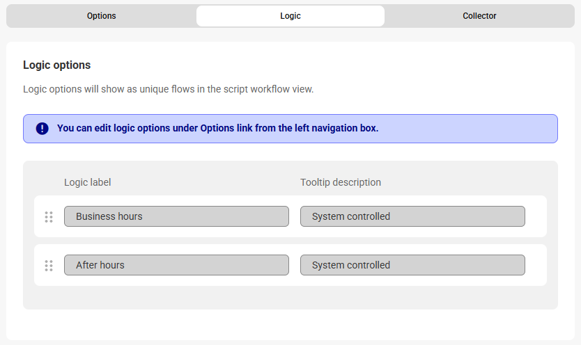 The Logic and Collector tabs will show system controlled functions, which cannot be edited.