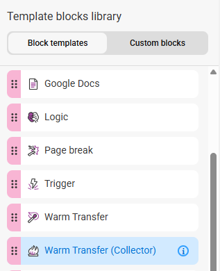 On the next page, click the Blocks tab, then select Add new block. From the Blocks list under Block Templates, locate and select the Warm Transfer (Collector) block.
