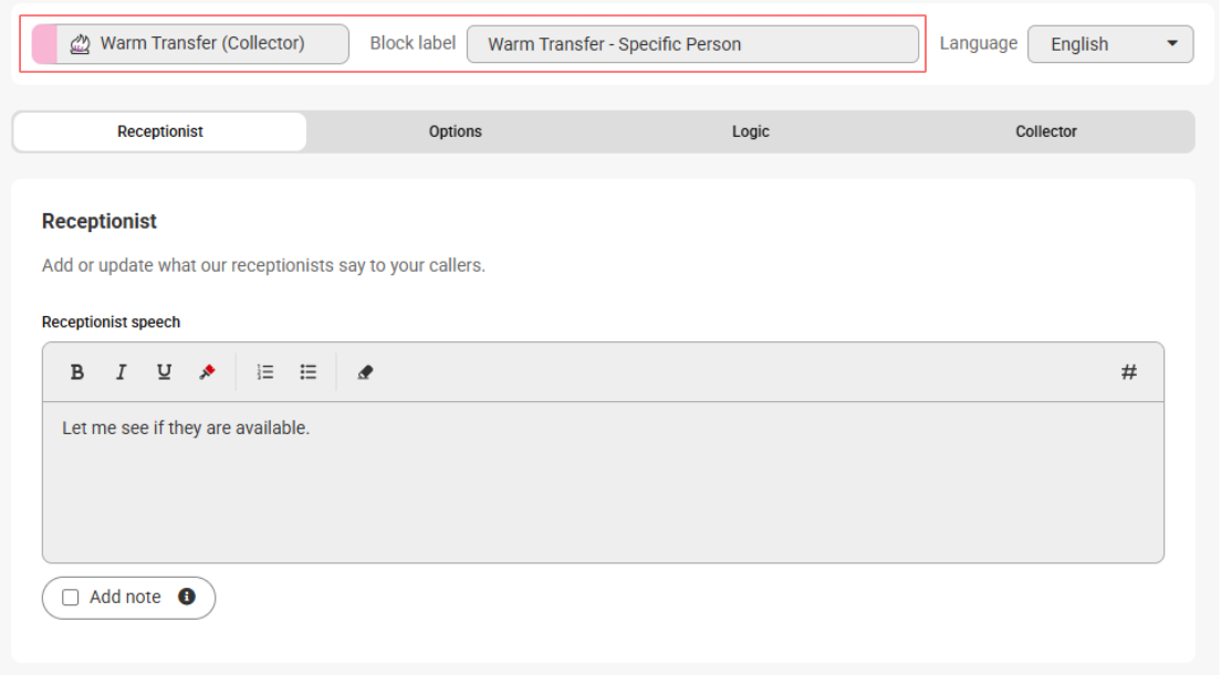 Once the block populates on your screen, you'll see the Block Type along the top of the block, and a space to add a Block Label next to it. Block Labels will help us identify the block within the system later on. We named ours Warm Transfer - Specific Person.