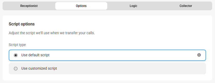 Under the Options tab, you can customize the transfer script, or use the system's default option. The default option will instruct operators to say: "Hello, this is {{agent_name}} from SAS with a call. May I transfer them through?" If you want to customize the script, check the Use customized script option and type in your own message.