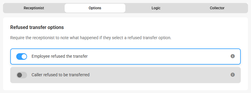If you'd like the agents to document why a transfer was refused, either by the caller or the recipient, you can use the applicable Refused Transfer toggles accordingly.
