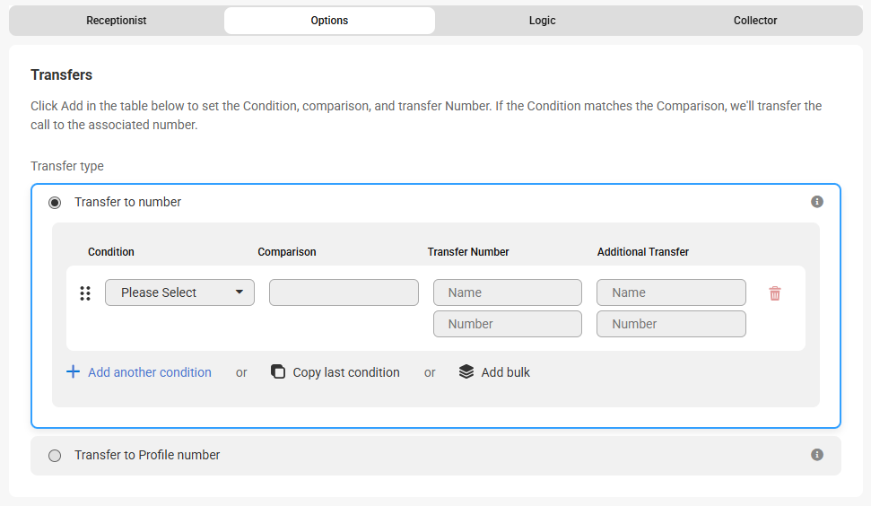 After you've configured your transfer script (if applicable), you'll need to choose where to transfer calls to. You can either select the Transfer to Number option and manually type in the contact's name and number, or you can choose the Transfer to Profile number option which will allow you to choose a specific Profile and number to transfer calls to.