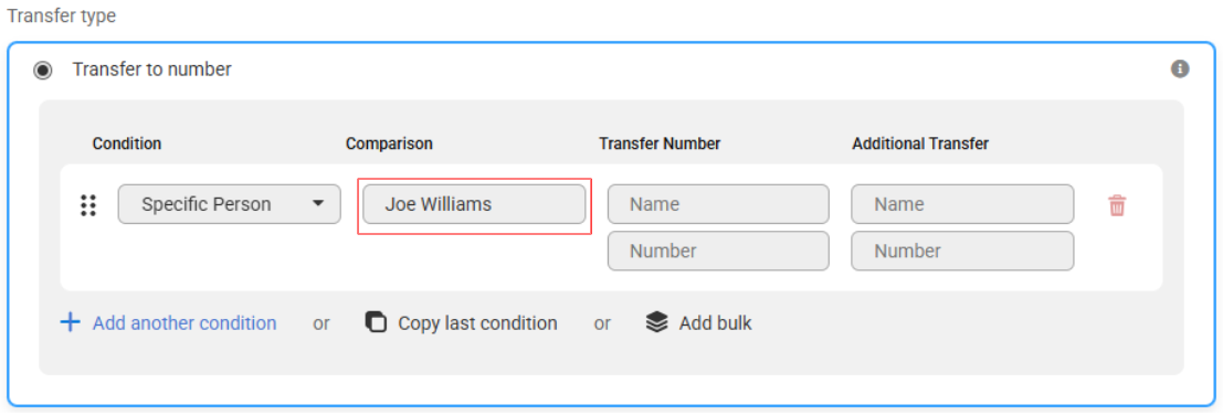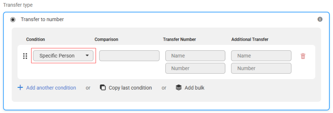 Once you've chosen how you'd like to transfer calls, you'll need to configure your Conditions and Comparisons accordingly. In our example, we'll match the Condition "Specific Person" to a Comparison of the name the agent selected from a Specific Person logic block. First, select your Condition from the appropriate dropdown. We'll choose Specific Person from our list of Custom Collectors.