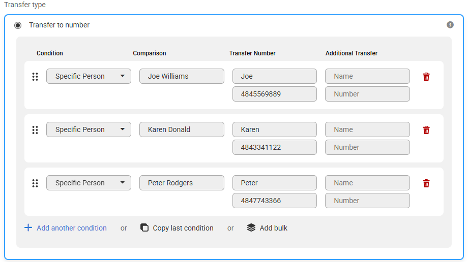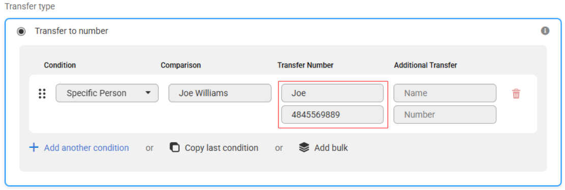 After your Condition and Comparison fields are completed, enter in the transfer number(s) accordingly. If you'd like our agents to attempt to dial 2 numbers for each staff member, add the secondary number in the Additional Transfer field.