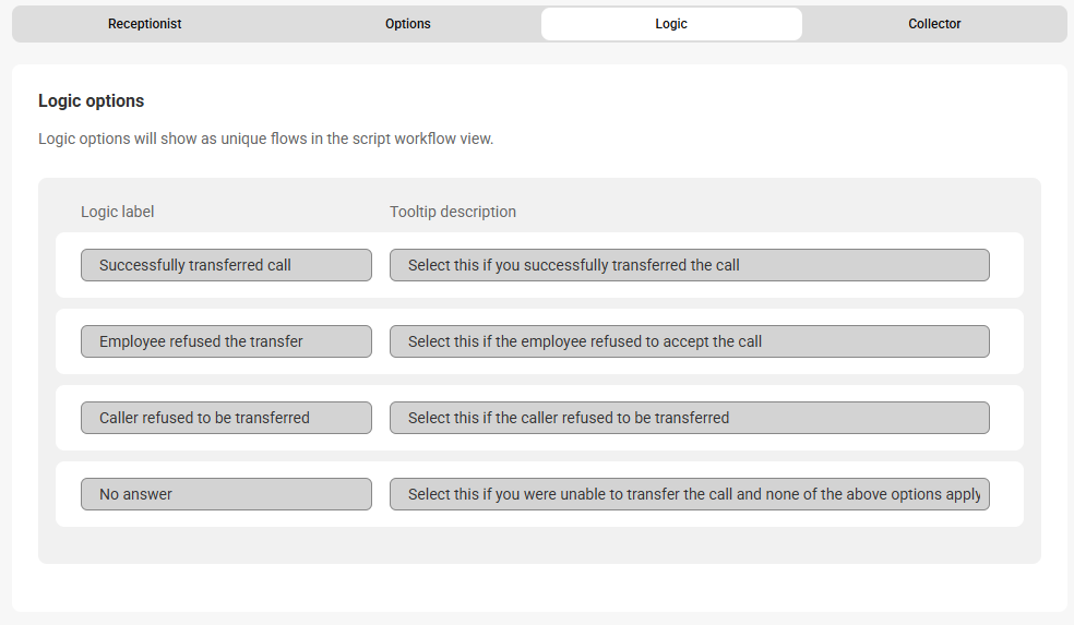 The Logic tab will show 4 pre-programmed options the operator can take depending on what happened on the call. These cannot be edited.