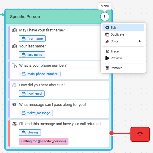 On the script workflow page, locate the script section you want to add the Warm Transfer block to and click the 3-dot menu icon to edit. In our example, we'll add the warm transfer to our Specific Person section.