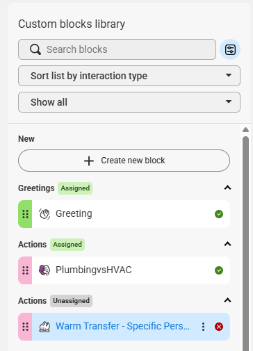 Locate your newly created Warm Transfer block under Custom blocks library, and drag it over to add it to the section.