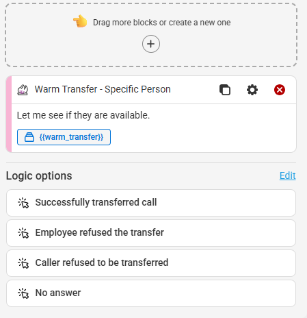 After the Warm Transfer block is completed, we'll need to go back and create the subsequent blocks that will match up with the options listed below. We'll be doing this in a later step.