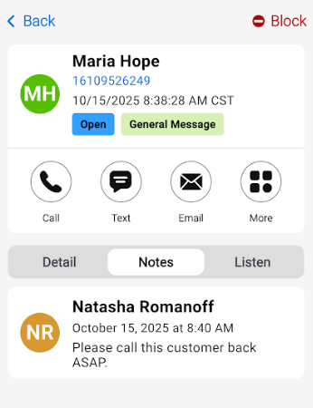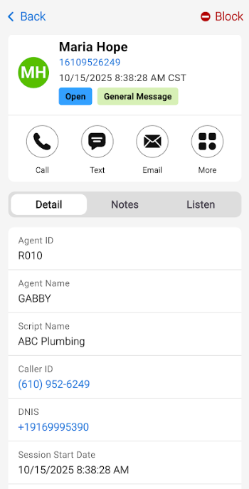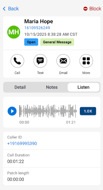 Upon tapping on a call, the Details tab will show you the details of the call. At the bottom of your screen, you'll see options to Call, Text or Email the caller back. You can also choose to block the caller by tapping the Block icon.