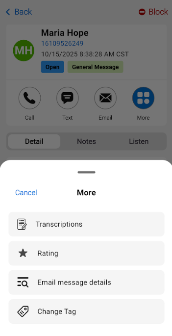 Tapping the More icon will allow you to rate the call, email the message details, change a tag or view the transcription.