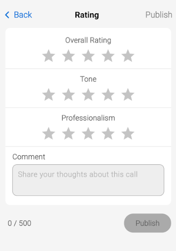 On the next screen, add your rating for Overall Rating, Tone, and Professionalism. Then add any feedback you have about the call and tap Publish.