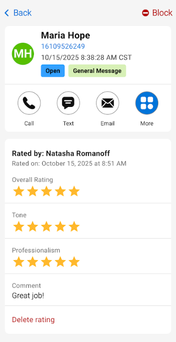 Once a call has been rated, it will be displayed as such. If you want to re-rate a call, tap the Delete rating button to reset the rating.