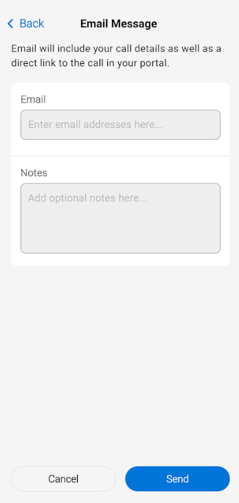Then enter the email address(es) you wish to send the call to, as well as any additional notes. When you are finished, click Send. The recipient(s) will get an email including your message as well as a direct link to the call in your portal.