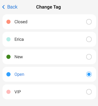 To change the tag on a call, tap the Change Tag button within the More options of the Details tab. The tag will automatically change from New to Open when you open the call within the app, but you can reset it by changing the tag from Open to New, or apply any other tag that you've added