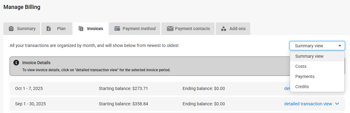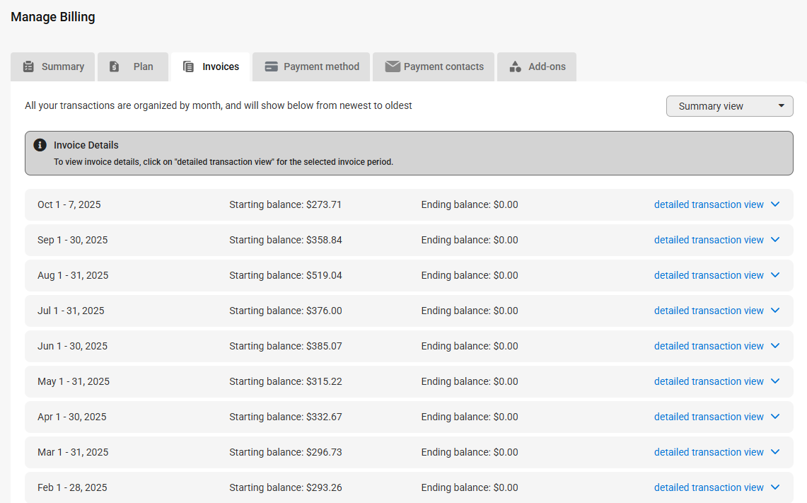 The Invoices section will provide an overview of all of your previous invoices. To see a breakdown of any invoice, click the detailed transaction view button next to the applicable invoice to view the details of that invoice.