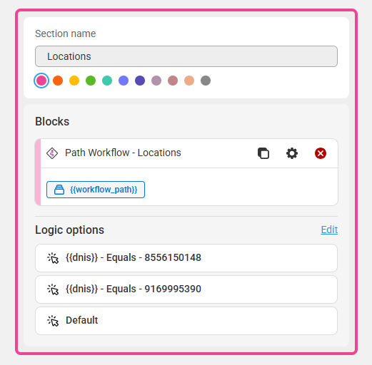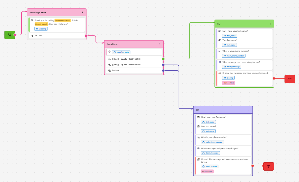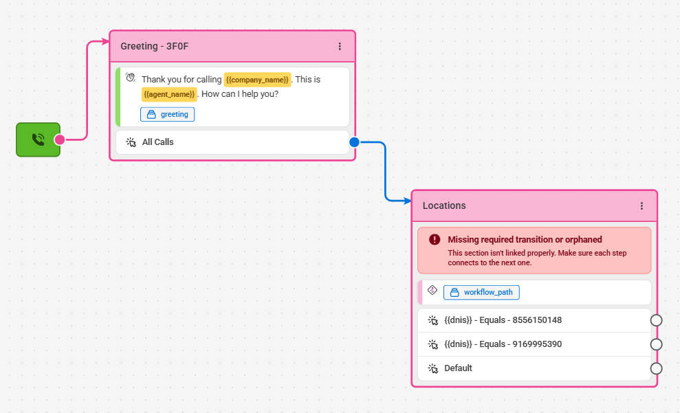 - Businesses with Multiple Locations or Departments: Businesses with multiple locations or departments may want to provide each department or location with their own SAS number that customers or employees can dial directly. Instead of having to configure separate scripts for each number, one script can be created in which all numbers are assigned. Using the DNIS variable in a Workflow (Path) block can automatically route the script without having to ask the caller which location or department they are calling for.