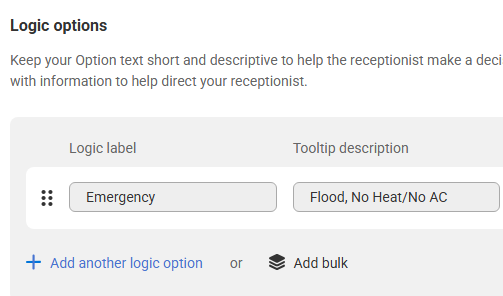 - Tooltips: Tooltip descriptions are short snippets of text that help describe each option to the operator when they hover over a logic option. For example, if your script has an Emergency path, adding examples of what constitutes an emergency for your company will help agents decide which path to take.