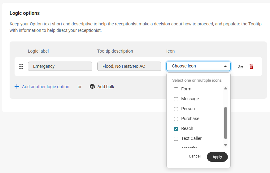 - Icons: Icons are images that will appear along with a little instruction when the agent hovers over a logic option. For example, if taking the Emergency path will result in a Transfer or a Reach, choosing the applicable icon(s) will help agents see what action will follow if they choose a certain path.