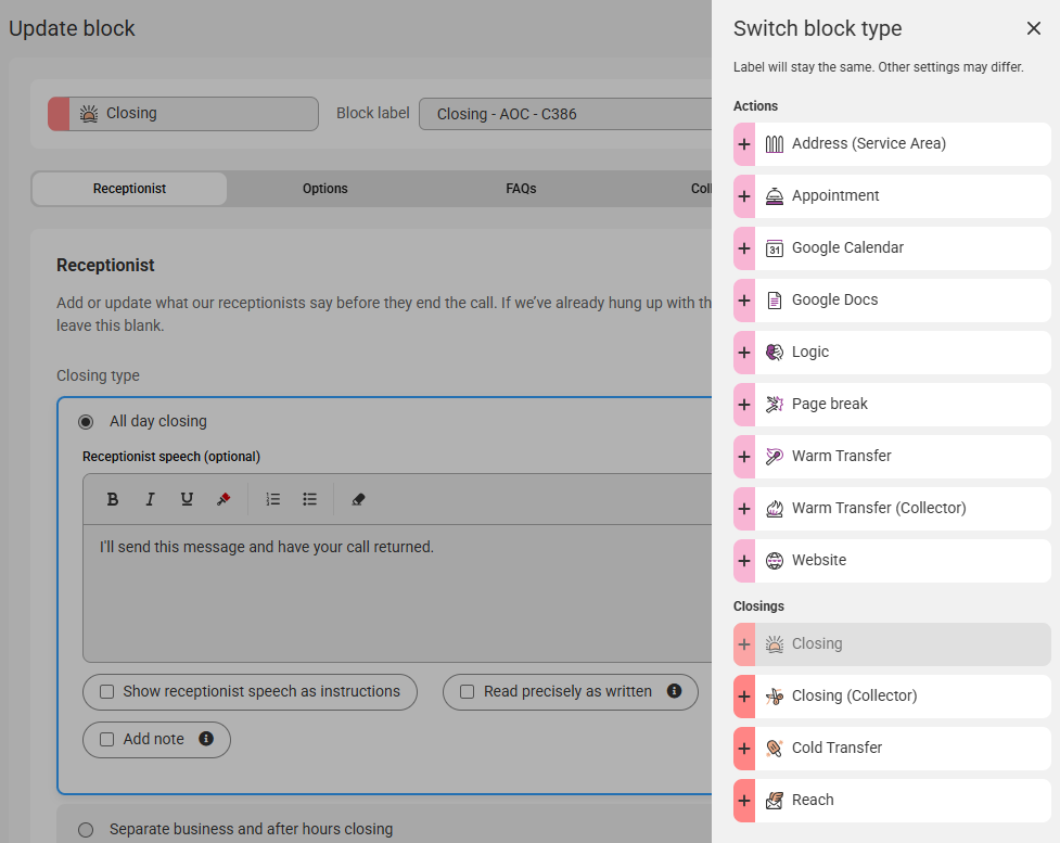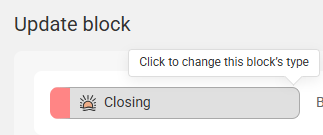 When editing your script, you may want to switch out one script block for another. For example, if your script is currently using a regular Closing block but you want to use a Reach block instead, you can easily change the Block Type in a few simple steps.