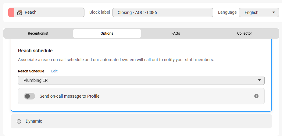 Once the new block type is chosen, you'll need to configure it accordingly. Since we've chosen to use a Reach block, we'll need to choose a Reach On-Call schedule from the Options menu. However, depending on what block you've chosen to switch out, the settings you'll need to configure may differ.