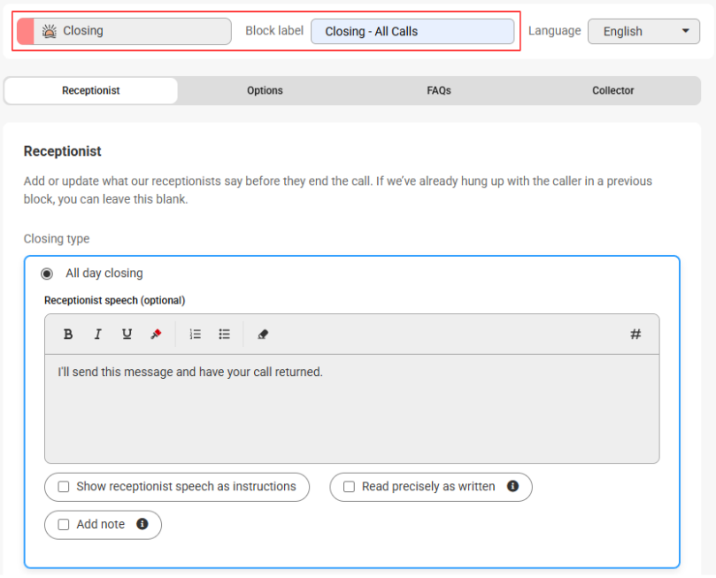 Under the Receptionist tab, we'll be using the All day closing option since we want the agents to use the same closing verbiage 24/7. If this option is chosen, standard text is pre-filled in the Operator Text. Feel free to customize this accordingly.