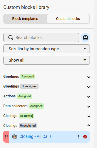 Once the block populates on your screen, you'll see the Block Type along the top of the block, and a space to add a Block Label next to it. Block Labels will help us identify the block within the system later on. We named ours Closing - All Calls.