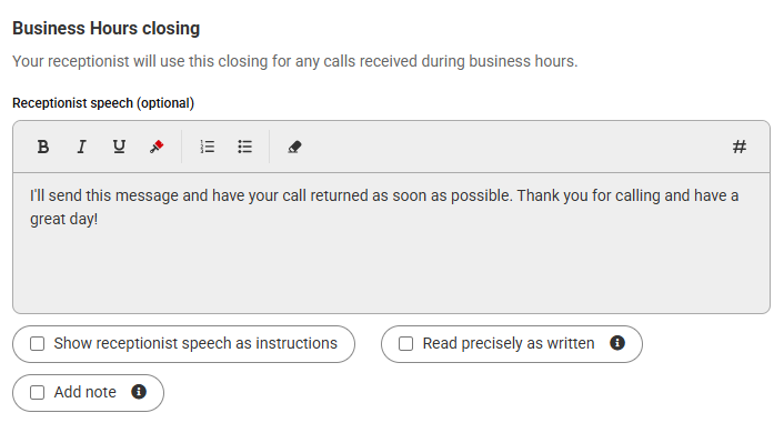 Next, fill in the operator text under the Business Hours closing section. In our example, we’ll be letting the caller know that we're sending their information along for a return call.