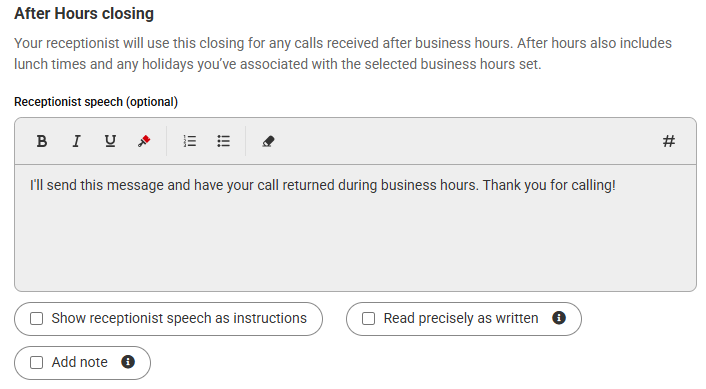 In the After Hours closing section, we'll add similar text, but we'll also include language letting the caller know that their call will be returned on the next business day.
