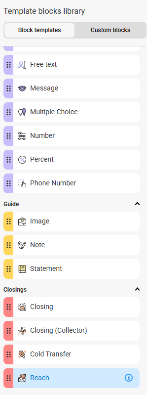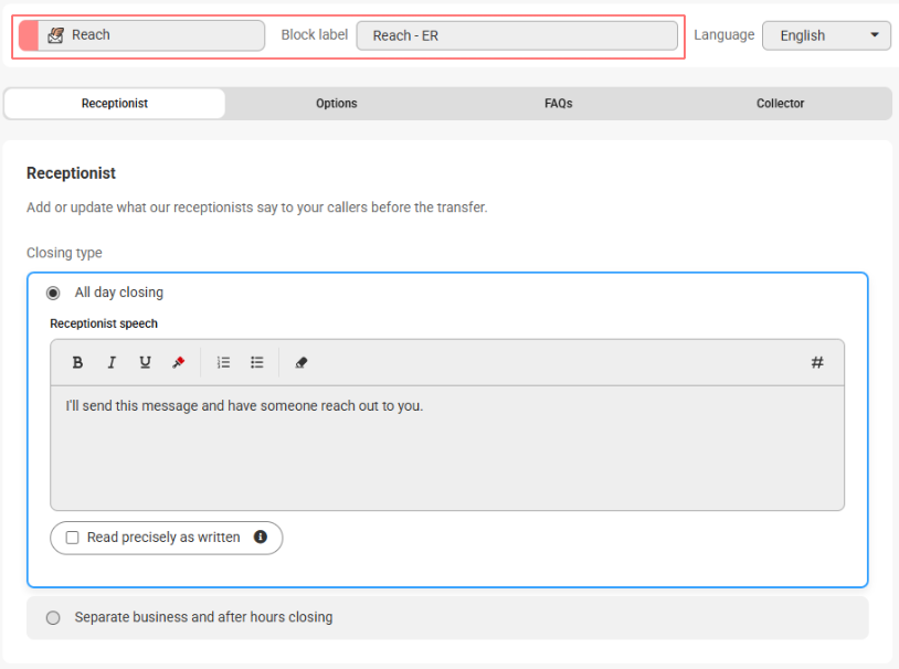 When building a script in SAS Flex, there are several options to choose from when deciding how to close out your script. In this article we'll show you how to configure a Reach script block.