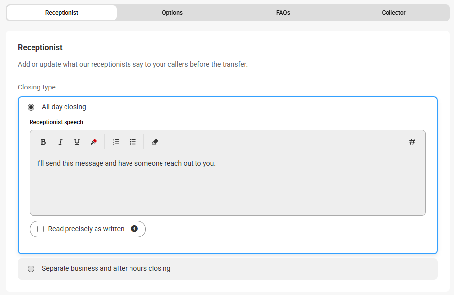 If you want the agents to say something different to callers when your office is closed for a holiday or during lunch, you can activate the Lunch closing and/or the Holiday closing and type in your respective text, as shown below.