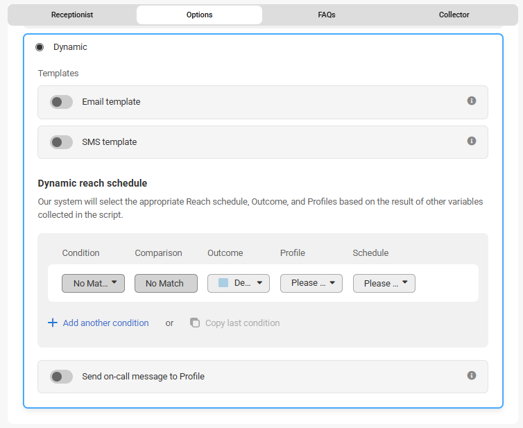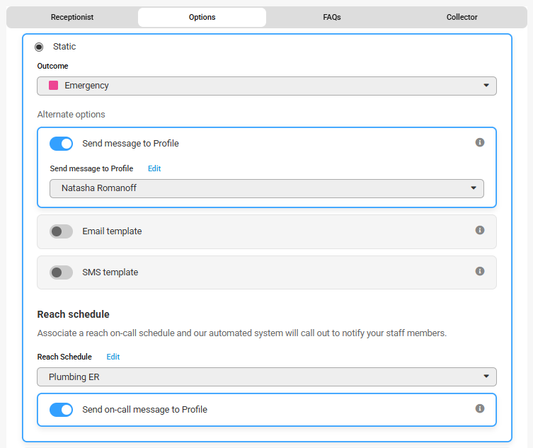 - Condition: Set your Condition based on how you want the system to choose to use one Reach schedule over another. For example, we want our Reach schedule to change based on if the customer is calling with a Plumbing or HVAC emergency. So, we'll choose the Plumbing or HVAC collector we've already set up.