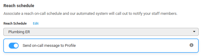 If you want your on-call staff to receive a text in addition to a phone call, you can select the Send on-call message to Profile option located beneath the Reach Schedule drop down. Selecting this option will send the message to the Profile of whichever staff members are on-call based on SMS or Email setup in each Profile. Messages are sent to all on-call recipients' Profiles simultaneously, prior to the start of the Reach.